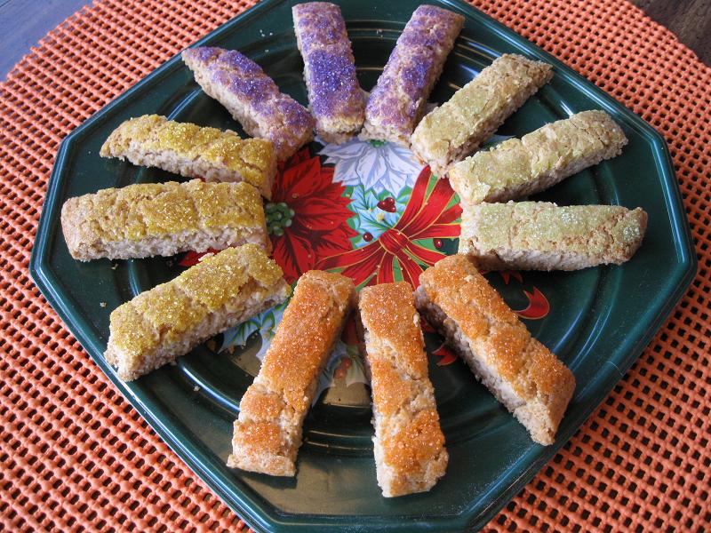 シアトルの街には、スウェーデンから移住してきた人たちが多くすむ地域があります。そういうところでは、スウェーデンの食料品を扱うお店があって、スウェーデンならではのお菓子も売っています。今日のレシピは、スウェーデンのアーモンドバタークッキーの作り方を少し応用したもので、イタリアのビスコッティーというクッキーを少し柔らかくしたような仕上がりになっています。季節柄少し色のついた砂糖の粗目を使うと、ホリデークッキーの雰囲気が出ると思います。(約50個分)
