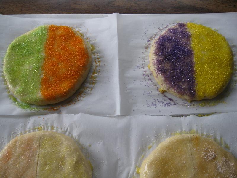 *ベーキングトレイに円状の生地を載せ、溶き卵を刷毛で塗り、カラーシュガーを振り掛ける。