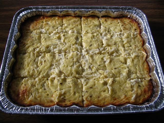 *この生地を油を引いたキャセロールパンに入れ、たまねぎの混ぜ物を上から入れる。