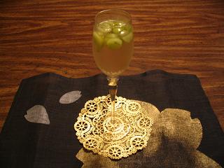 * 凍ったぶどうを、シャンパングラスに入れ、シェーカーの穴からウォッカとジュースを注ぐ。