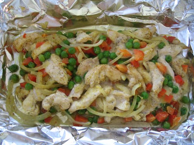 鶏肉をホイルに包んで焼くと柔らかく仕上がります。カレー味の黄色に加えて、赤ピーマンとグリーンピースという色の濃い野菜を使って、栄養たっぷりです。(4人分)