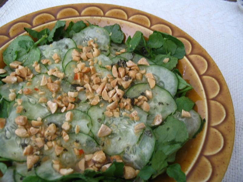 花火の季節です。アメリカでは独立記念日には華やかな花火のショーがあちこちで行われます。暑いときにはさっぱりサラダ。今日のレシピはタイのキュウリサラダです。好みでクレソンかルッコラを使ってください。ライムドレッシングであっさりと仕上げています。(4人分)
