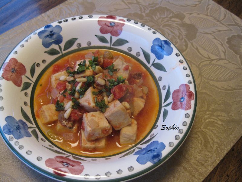 フィッシュシチューにもいろいろありますが、今回はマグロ"Tuna"とかメカジキ"Swordfish"といったような、身の引き締まった魚を使う、シシリア風のフィッシュシチューのレシピです。トマトベースですが、レーズンを入れて、ほんのり甘味を出しています。ガーリックとオリーブオイルを塗ったパンと一緒に召し上がってください。(6〜8人分)