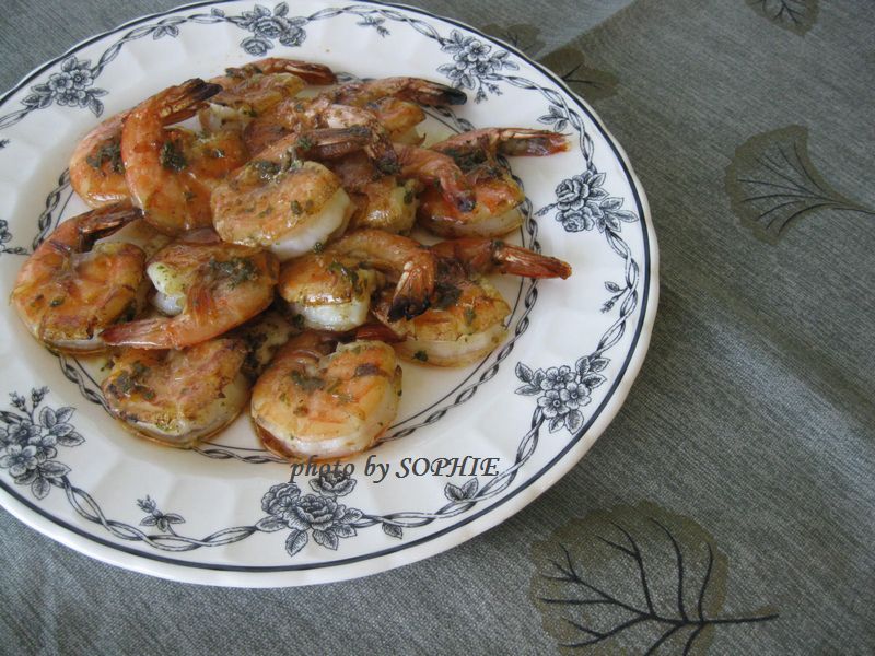 *マリネから取り出したた海老をグリルで数分焼き、上から残りのソースをかけて出す。