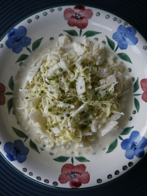 コールスローはこれまでに何度か作っていますが、今回は20世紀梨を混ぜていることと、バターミルクを加えているところが違います。少し酸味が増して、シャキシャキした感じの食感になります。とにかく材料を切って混ぜるだけの超簡単レシピです。(4人分)