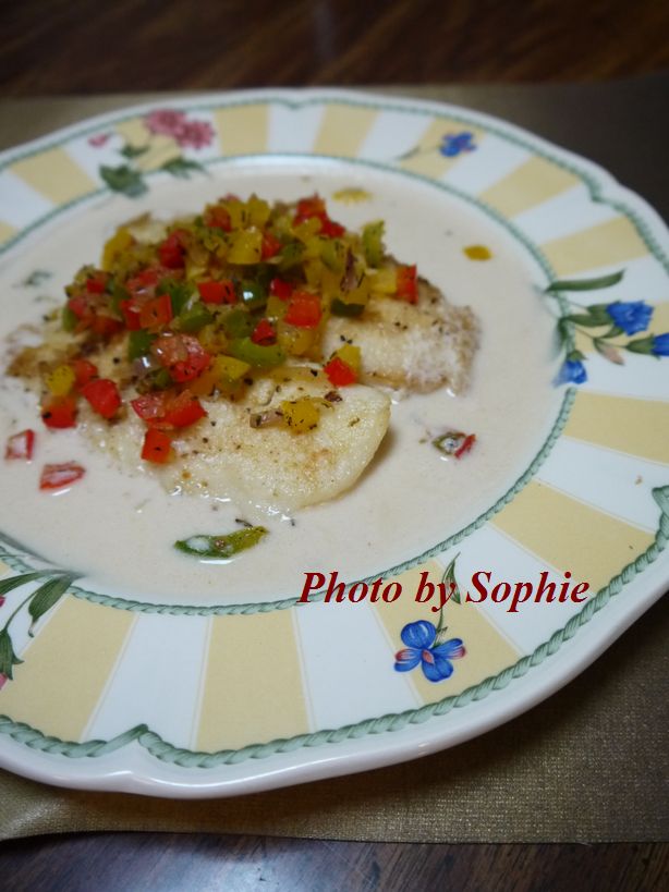 *魚の両側に塩胡椒し、両面を小麦粉にまぶして、余分な粉を落としておく。