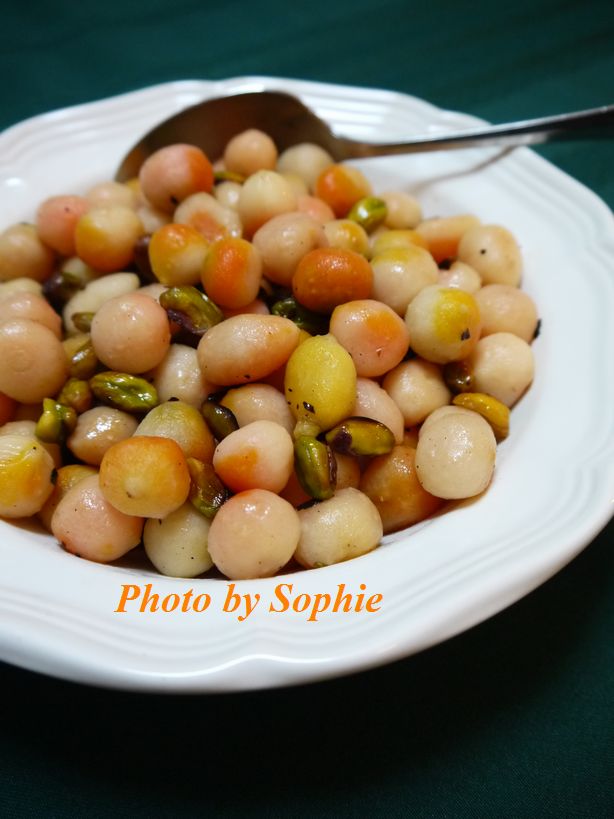 人参は、冷凍の丸く切っていいるものを使いました。色が抜けていて人参には見えにくいですね。今日のレシピでは、最後にピスタチオナッツとクワントローを混ぜて仕上げるので、アルコール分がそのまま出ますから、お子様には向いていません。(6人分)