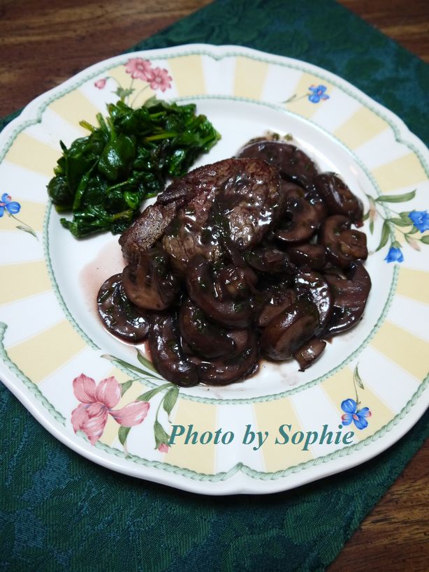 牛肉はできるだけ控えていますが、ごく稀に作ります。そういう時はやはり良質の材料を使いたいですね。肉はオーブンで焼きあげて、マッシュルームを煮込んだソースをかけて食べるレシピです。(4人分)