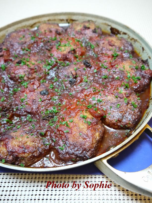 ミートローフはこれまで何回も作っていますが、今日のレシピはどちらかというと、日本式には煮込みハンバーグと言った方がぴったりくるかもわかりません。アメリカ式のミートローフは普通、パウンドケーキ型に入れて焼くことが多いのですが、今回は小さいハンバーグを作ってから、ちょっと手間をかけたソースで煮込む作り方になっています。挽肉は好みの肉を使ってください。私は今回ラム肉を使いました。あまり好きな肉ではないのですが、今日のようなソースで煮込むやり方だと、臭みが和らぐかなと思って使ってみました。(6人分)