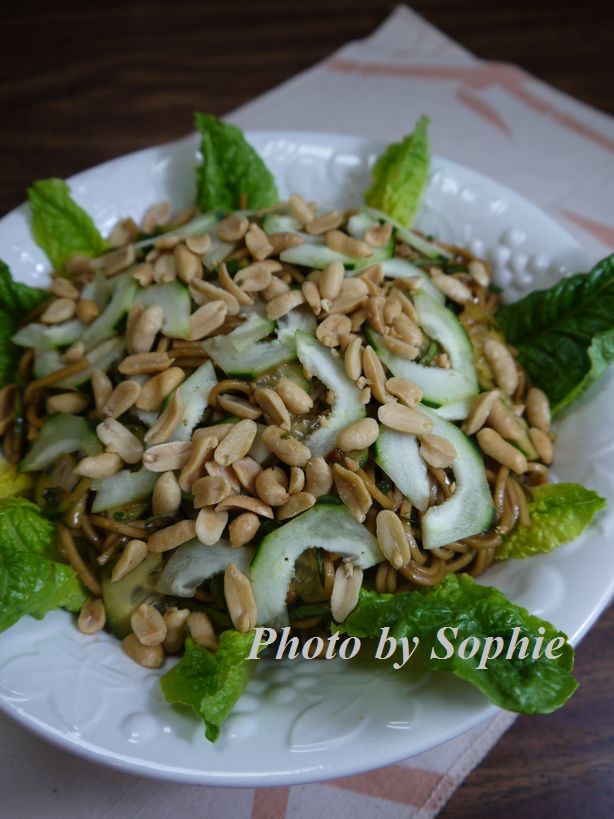 *皿かボウルにレタスを敷き、?を置いたら、残りの胡瓜を載せて、ピーナッツを散らす。