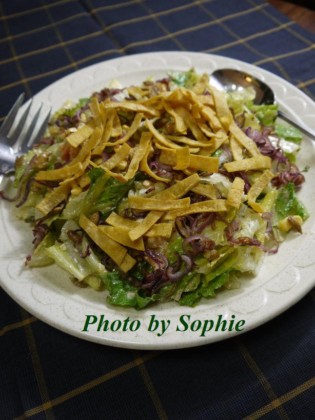 シーザーサラダは過去に何回も作っていて、この前は、アジア風のシーザーサラダを紹介しましたが、今回はサウスウェスタンということで、具材にトルティアが入ったり、ドレッシングにはアドボソ−スに浸かったチポートル・チレが入ったりしてスパイスを効かしています。(8人分)