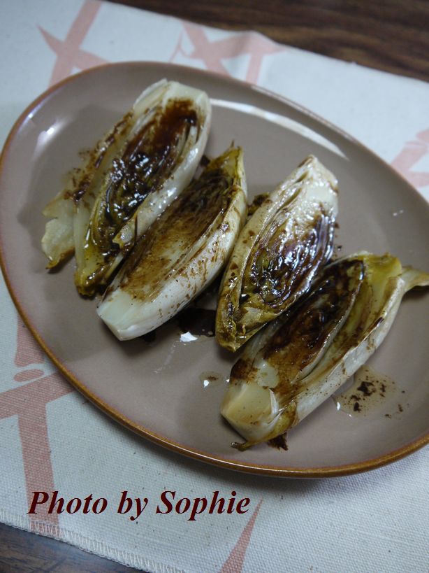 チコリの簡単ソテーレシピです。砂糖の隠し味もあって、ちょっと焦がしてしまいましたが。バルサミコ酢を使うので、その分黒っぽいですが、深みのある味になります。オリーブオイルはエキストラバージン、バルサミコ酢もできるだけ品質の良いものを使ってください。"The New York Times"に載っていたレシピです。(3人分)