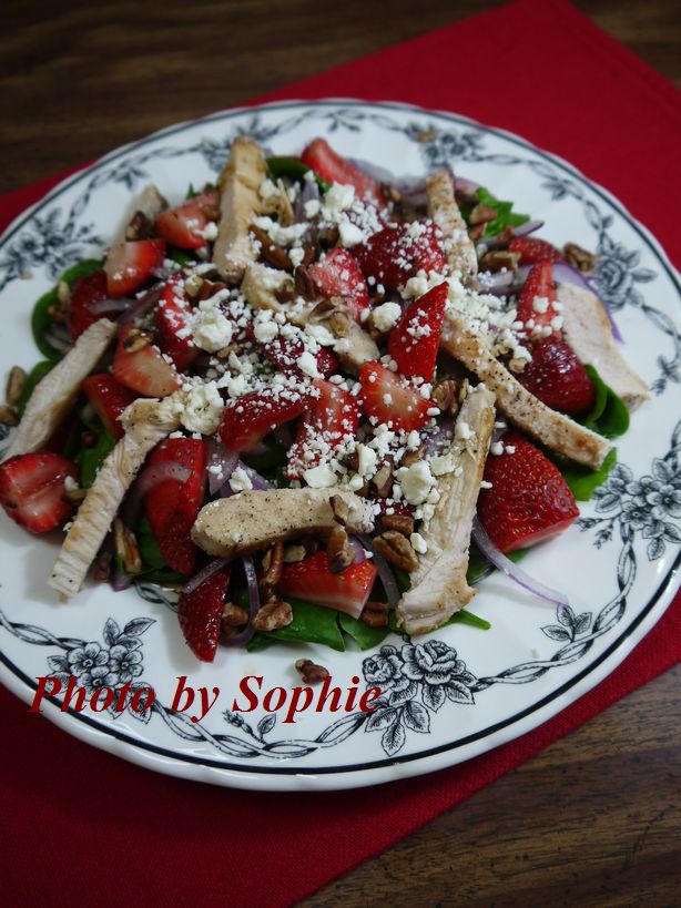 メインディッシュのサラダになるレシピです。鶏胸肉と苺がたくさん入って、ピーカンもアクセントに加わっています。時間がなければ、すでにローストしてあるチキンや、袋入りのほうれん草を使えば、簡単に用意できて、彩もよく、お味も満足でした。"Cooking Light"に載っていたレシピです。(2人分)