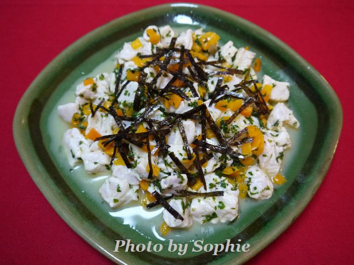 ハリバットを使って、セビーチェを作りました。新鮮なオヒョウが手に入ったときに作りたいレシピです。黄色のパプリカで少し色を添え、ライムを利かせて、トッピングに、のりを散らしています。オードブルに最適ですが、ライトサパーのメインにしてもいいと思います。"Cooking Light" に載っていたレシピです。(4人分)