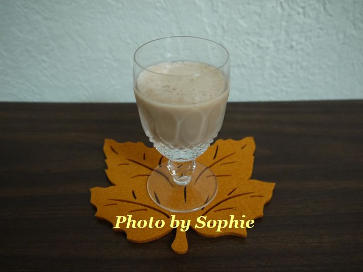 *すべての材料を、かき氷を加えたシェーカーに入れて振り、カクテルグラスに注ぎ、シナモンを振りかける。