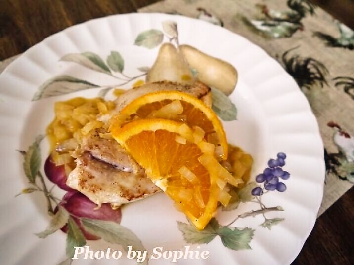 *皿にチキンカツレツを置き、鍋のソースをかけ、オレンジの薄切りを添えて出す。