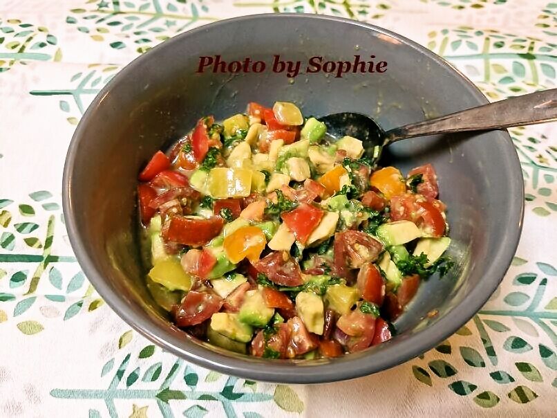 *トマトは芯を取り、アボカドは種を取り、皮をむいて、それぞれ5mm角ぐらいに切る。