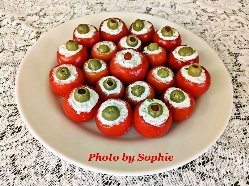 カニの身をチェリートマトの中に仕込んだオードブルのレシピです。元レシピでは、中くらいのトマトに詰めるようになっていたのと、上に飾るオリーブを刻んで載せるようになっていたのですが、チェリートマトを使って、オリーブを半分に切って載せたら、まるでハロウィンの目玉のようになった感じがします。一口サイズにしなくていい場合は、元通り普通サイズのトマトを使ってください。詰めはが余っても、クラッカーに載せて食べるとおいしいので、パーティー用に活かせます。このレシピは、"Cooking for Company" で見つけました。