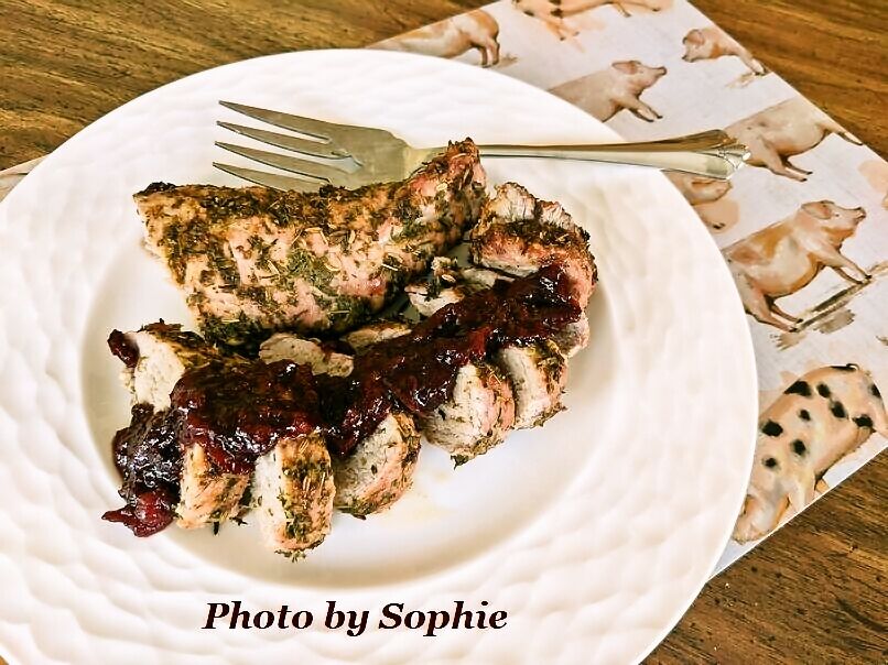 *豚肉を適当な大きさに切り分け、プラムジャムソースをかけて出す。