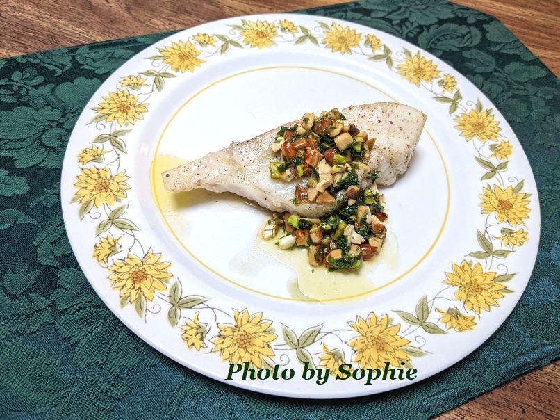 *魚が焼けたら皿に取り、パセリの茎は捨てて、ミックスナッツのサルサをかけて出す。(余分なものは別に添える。)