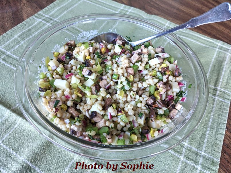 アンティパストサラダのレシピです。元レシピは、フレグラ "fregola" を使っていましたが、パール・クスクス(イスラエル・クスクス)で代用できます。あのプツプツした大粒のクスクスですね。これに、ペパロンシーニや、マッシュルームにゴーダチーズといった、アンティパストに使うような食材を使って、ドレッシングで和えます。フードネットワークマガジンに載っていたレシピです。(6〜8人分)