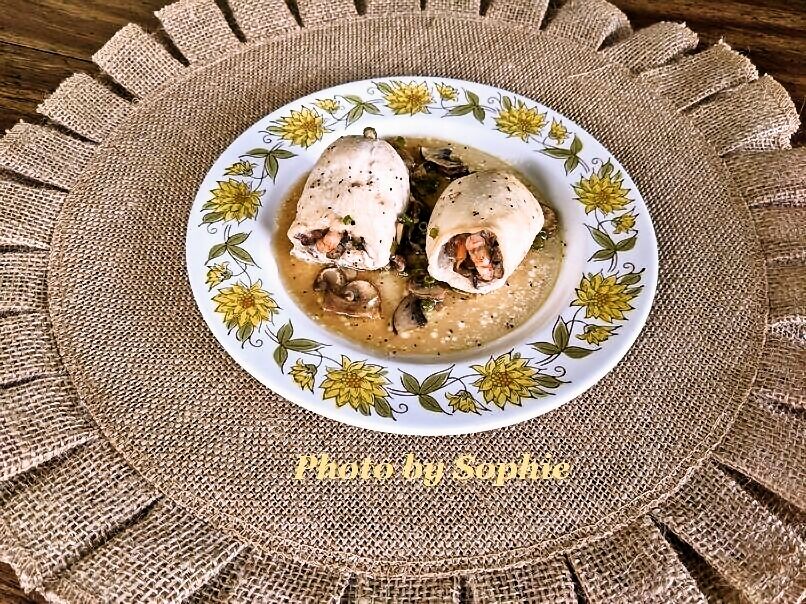 チキンロールのレシピです。鶏胸肉の半身を薄くのばして、エビやカニの入った豪華な詰め物をして巻いていきます。ワインを注いでオーブンで焼いた後、液体を煮詰めてソースにし、ロールの上にかけて仕上げます。"America's Best Recipes" に載っていたレシピです。(8人分)