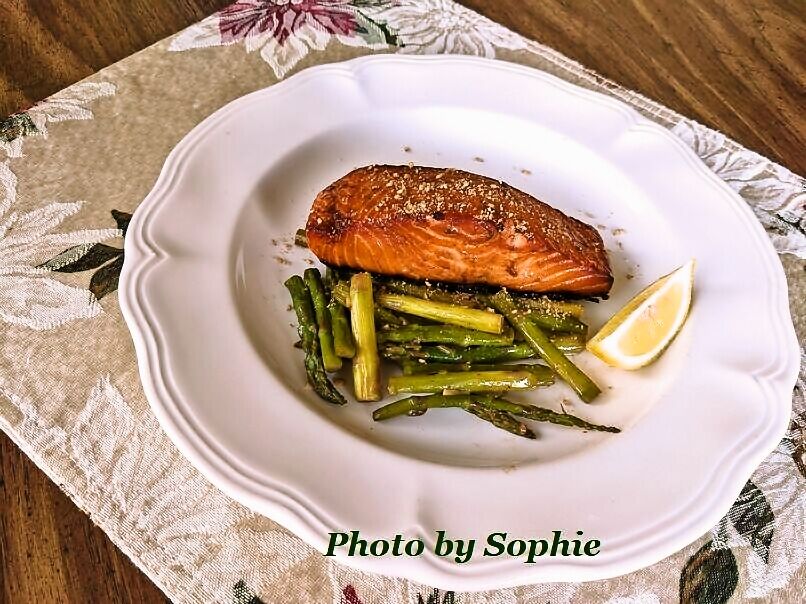 鮭をホイシンソースでマリネしてからオーブンで焼き、ニンニクやスパイスでソテーしたアスパラガスと一緒に出します。前の晩からマリネしておけば、夕飯前の用意が簡単。今日のレシピは、"Cuisine at Home" に載っていました。(4人分)