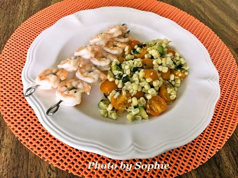 *グリルの中火で串刺しの海老を、片面2〜4分焼いたら、コーンサラダと一緒に出す。