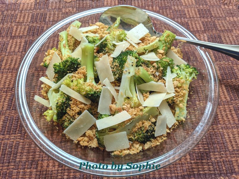 ブロッコリーのレシピです。感謝祭も近づいてきたので、副菜の1つに加えてもいいメニューです。味付けはシンプル。胡椒を効かせて焼いたパン粉とチーズがアクセントになって、美味しくできました。(4〜6人分)