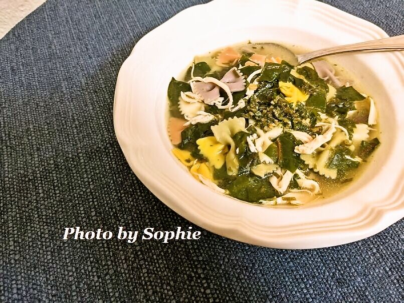 アメリカでよくあるタイプのチキンヌードルスープは以前に作ったことがあって、その時はエッグヌードルを使いましたが、今回はショートパスタで作ります。また、チキンは前回挽肉を使ったのに対し、ここでは調理済みの鶏肉を引き裂いて使っています。一口大に切ってもいいし、何ならタイトルから離れますが、調理済ライスを使うこともできます。今日のスープはチキンというよりは、緑の野菜とパスタが主役です。緑野菜のチョイスも、今回使ったスイスチャードの他に、ケールやマスタードグリーン、またはほうれん草でもかまいません。お好みの具材を混ぜ合わせて応用してください。このレシピは、"Better Homes and Gardens" で見つけました。(4人分)