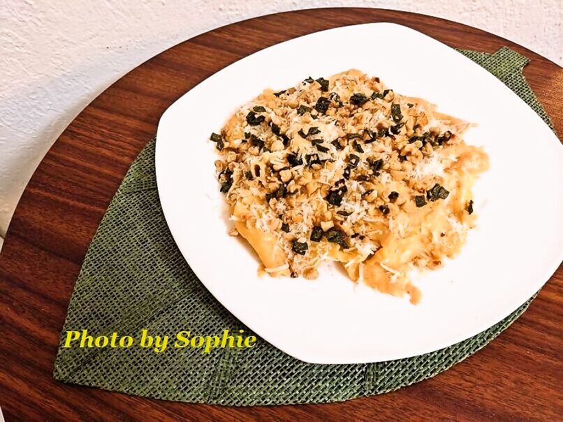 チーズラビオリに、缶詰のパンプキンピューレと生クリームを使ったソースを絡めていくレシピです。ブラウンバターに、トーストしたヘーゼルナッツやセージの葉を加えてアクセントを付けています。America's Test Kitchen というサイトで見つけたレシピです。(4人分)