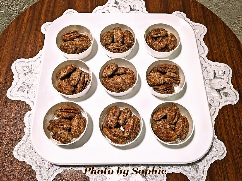スナック・ナッツのレシピです。ピーカンを使って甘辛く仕上げています。ポットラックにもいいし、ホリデーシーズンのギフト交換にももってこいです。瓶に入れておけば長く持つし、冷凍保存もできます。私はクッキー・エクスチェンジに持っていったら、とても好評でした。オリジナルレシピよりも砂糖は少なめに使ったので、甘味が足りないという方は、もう少し増やしてください。ピーカン以外にも、アーモンドやクルミでも応用できます。(2.5カップ分)