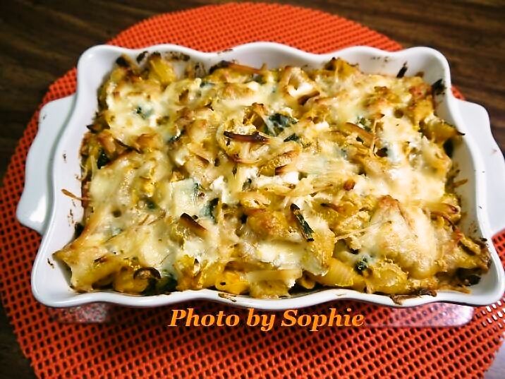 *これをベーキング皿に入れて、リコッタチーズを載せ、残りのおろしチーズを振りかけて、オーブンで10〜15分焼く。