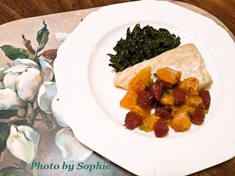 ハリバットのレシピです。オヒョウをスイスチャードと一緒に焼いて、スパイシーなシトラスフルーツのサルサを添えて出します。私はブラッドオレンジがあったので、普通のネーブルの代わりに使いました。お陰で色のコントラストが鮮やかになりました。"One Pan & Done" という本に載っていたレシピです。(4人分)