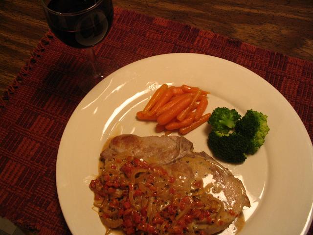 ポークチョップと、それにかけるロースト赤ピーマンのクリームソースを一つのお鍋で調理してしまうので、後の片付けも楽にできるレシピです。鍋に残った豚かすもソースに入って一石二鳥。(4人分)