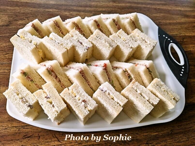 アフタヌーンティーや、パーティーのオードブルトレイに使えるミニサンドを作りました。2種類のフィリングで、1つはパイナップルとチキン、もう1つはハムとセロリです。両方とも、クラッカーの上に載せたりするのにもちょうどいいスプレッドになっています。作り方は至って簡単。材料を混ぜてサンドイッチパンに挟むだけ!オードブルのレシピ本で見つけました。