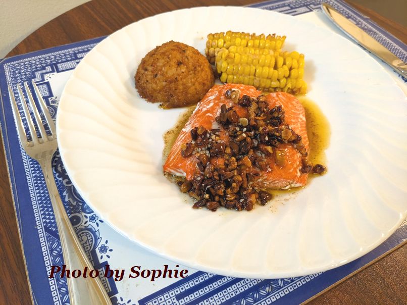 サーモンのベークレシピです。ご存知のように、鮭はオメガ3の宝庫。それにナッツのサルサを添えることで、心臓や血管に健康的な影響を与える食材の組合せになります。ホリデーシーズンに体に優しいレシピです。ナッツサルサは、数日前に作っておくこともできます。これは、"bon appetit" という料理雑誌に載っていました。(4人分)
