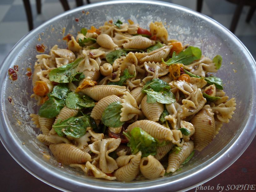 パスタサラダに、チェリートマトとルッコラを組み合わせたレシピです。パスタは手持ちのシェルパスタとリボンパスタを使いましたが、ショートパスタなら何でも結構です。チェリートマトも、赤と黄色が両方あったので混ぜて使いましたが、一色だけで十分です。ローストして使うので、後で混ぜると皮がむけたりします。チーズは好みで加えてください。室温でも冷たくして出しても構いません。(4人分)