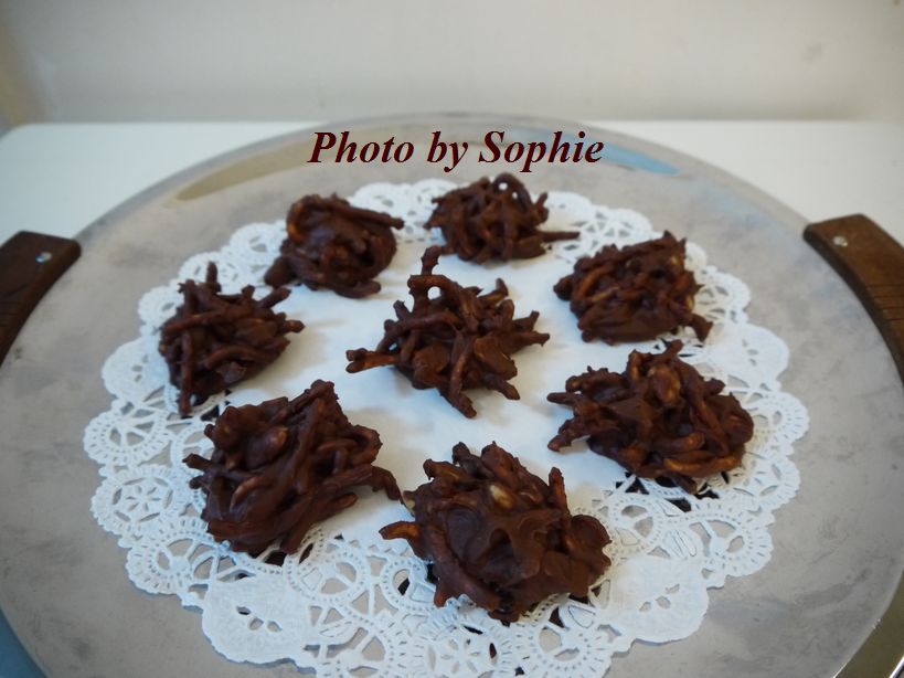 *大さじを使って、フィリングを少しずつ取り、チョコレート生地の上に満遍なく落としていく。
