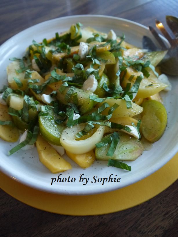 カプリスサラダって、普通は肉厚のトマトにフレッシュ・モッツァレラチーズの組み合わせなんですが、今日紹介するレシピでは、エアルームトマトにネクタリンを加えて使っていて、ちょっと新鮮な感じ。エアルームトマトは色が選べるのですが、せっかくだから普通の赤はやめて、黄色や緑を使いました。さわやかな感じがしていいと思います。オリーブオイルはエキストラバージンを使ってくださいね。バルサミコ酢は白がなければ普通の物でも大丈夫。このレシピは、サンセットマガジンに載っていました。(6人分)