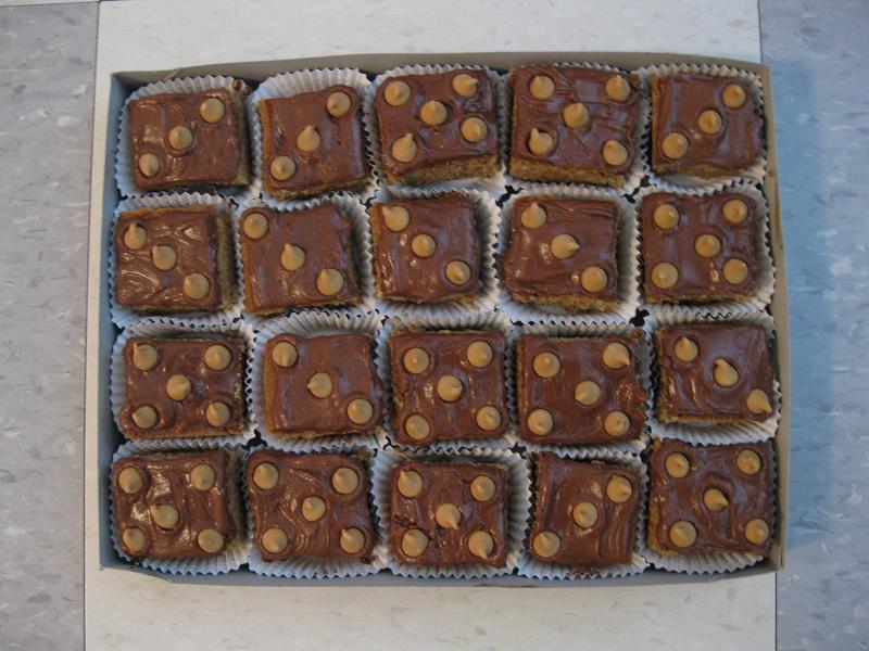 *冷めた生地にフロスティングを載せ、ピーナッツバターチップスを散らして切り分ける。
