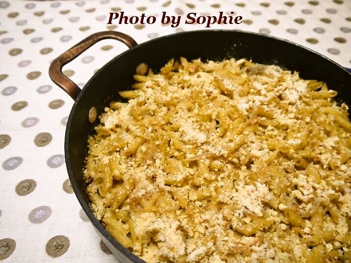 *茹で上がったらスキレットに加えて、おろしチーズの半量を混ぜ入れ、パン粉を散らして、最後に残りのチーズをかける。