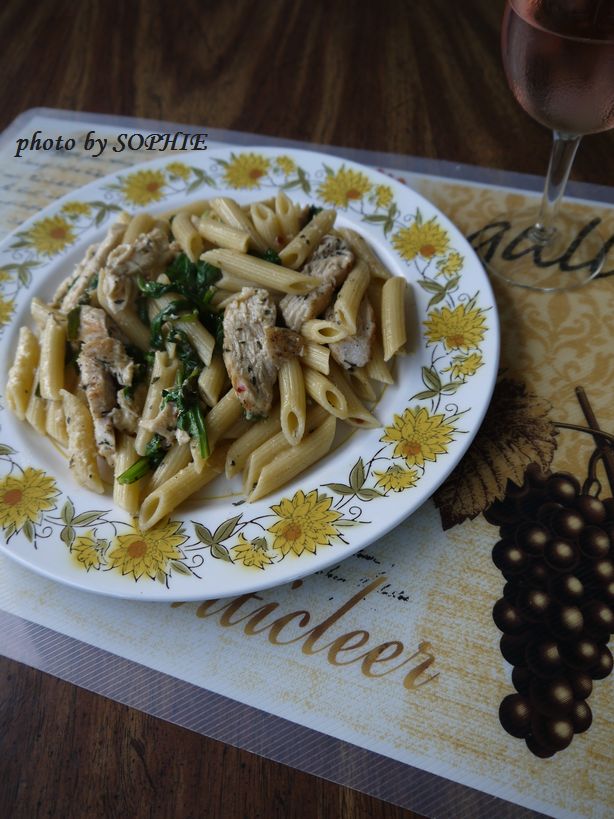 *これにパスタ、チーズ、微塵にしたローストパプリカ、ルッコラ、オリーブ、好みでパインナッツを混ぜる。
