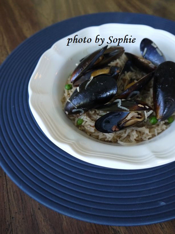 *ムール貝を戻して、グリーンピースを入れ、塩コショウで味付けする。