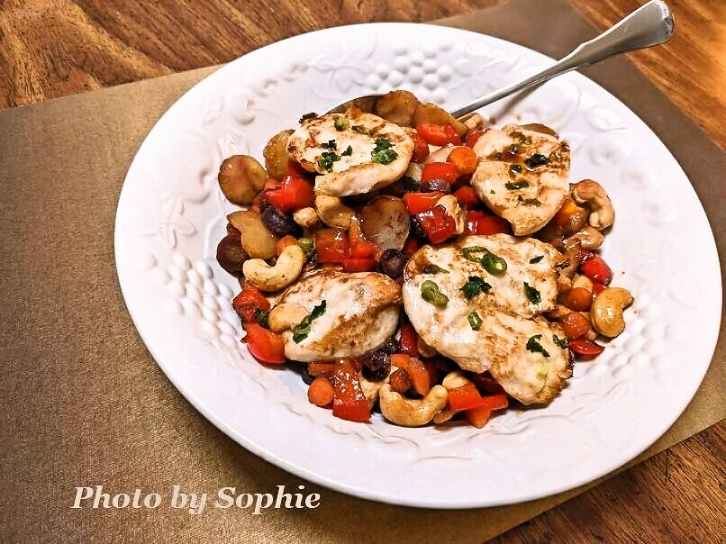 カシュ−チキンの炒め物は以前にも紹介したことがありますが、今回は、前回ほど材料が込み入ってなくて、手順もシンプルです。最近よく使っている、"One Pan & Done" に載っていたレシピです。(4人分)