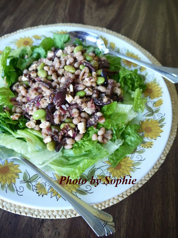 枝豆だけで作るはずだったのですが、足りなかったので代わりに白い豆をたくさん使うことにしました。カラマタオリーブがなければ、ブラックオリーブで代用できます。レタスの代わりに、ほうれん草とか、濃い緑の葉野菜と混ぜても大丈夫です。Relish.comに載っていたレシピです。(4人分)