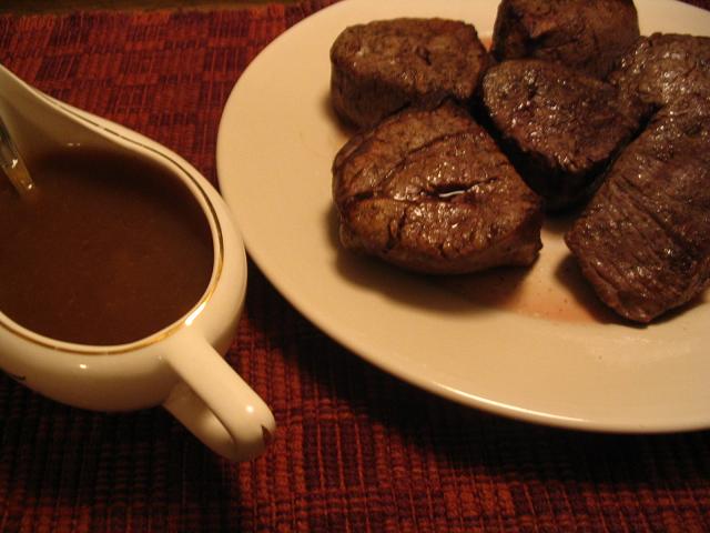 *フライパンに大さじ4のバターを熱し、牛ヒレ肉を素早く炒めて熱い皿にとる。