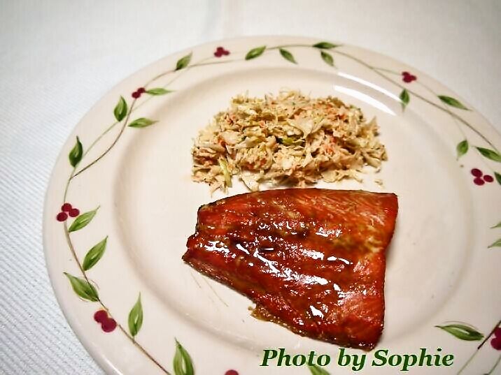 サーモンに甘辛グレーズをかけて焼き、ラシナトケールに洋梨とチェダーチーズを加えたサラダを添えます。カリッとした食感を加えたい場合は、トーストした胡桃かピーカンなどのナッツを加えるといいです。"Cook's Country" に載っていたレシピです。以前に、鮭にタイ風のグレーズをかけたり、ハニーマスタードグレーズのレシピも紹介しています。よかったら、そちらも参考にしてください。(4人分)